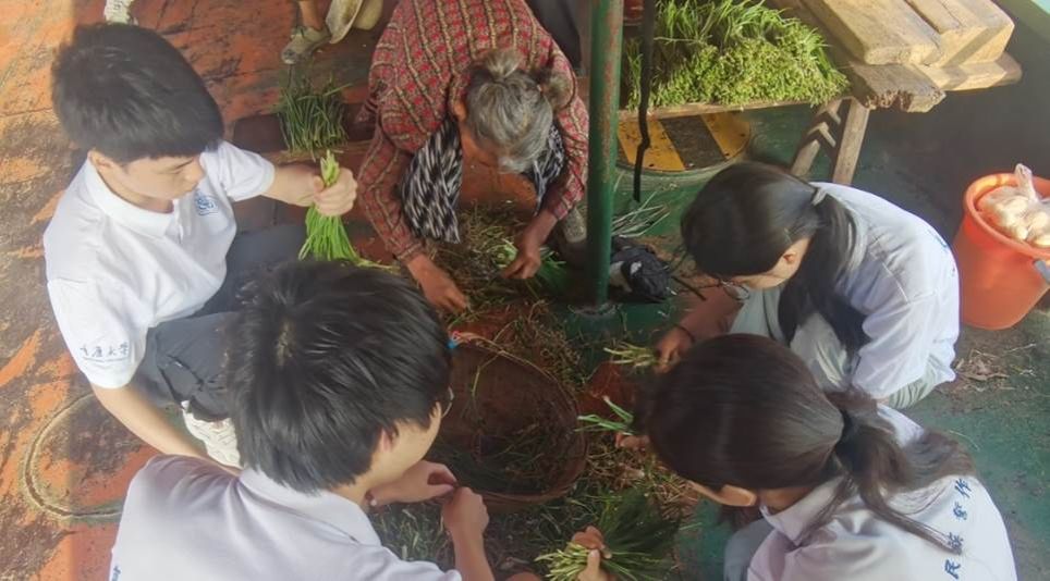 图3 实践团成员在“渝忠客2180”渡轮上帮助菜农择菜